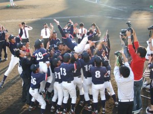 大学野球部の同期4人で母校のリーグ優勝を祝った。